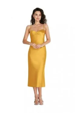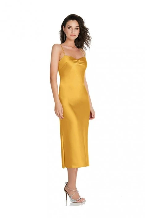 Style 8220 from Dessy Social is a sleek and sexy lux charmeuse midi length bridesmaid dress. A delicate shirred detail brings out the curve of the subtle sweetheart neckline. The convertible spaghetti straps allow you to wear it in a different way each time.