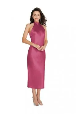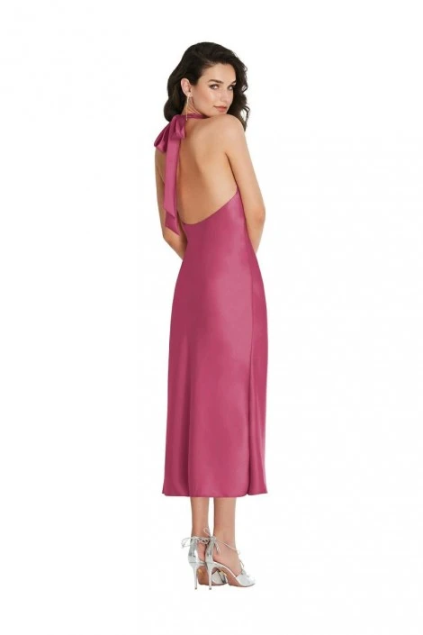 Style 8222 from Dessy Social is a midi length lux charmeuse bridesmaid dress. This classic high neck style has a halter scarf tie with a low open back. The flowy skirt with side slit adds to its ease of movement.