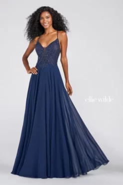 Style EW122087 from Ellie Wilde by Mon Cheri is a chiffon A-line prom gown with a deep V-neckline with mesh insert, stone accented bodice, and thin straps that criss-cross to an open back.