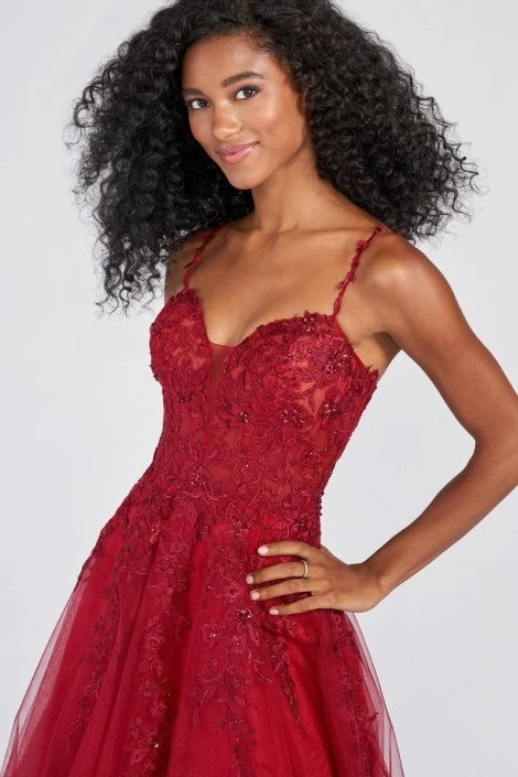 Style EW122093 from Ellie Wilde by Mon Cheri is an A-line prom gown with a deep V-neckline with mesh insert, stone accents, open back, and an embroidered tulle skirt.