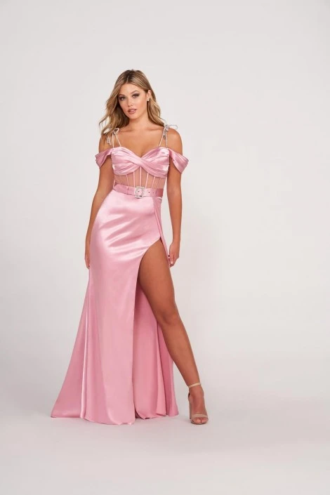 Style EW34010 from Ellie Wilde by Mon Cheri is a one-of-a-kind soft satin prom gown with a sheer corset bodice that has a belted waist with crystal embellished clasp. The sweetheart neckline has thin over the shoulder tie straps and draped off the shoulder straps. The sheath skirt with train features a high leg slit to help you glide across the dance floor with ease.
