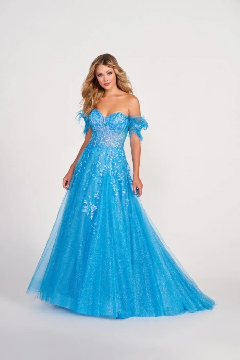 Style EW34013 from Ellie Wilde by Mon Cheri is a glitzy sequin embroidered ball gown with detachable, off the shoulder feather sleeves on a sweetheart neckline bodice. The embroidered sequin pattern cascades from the fitted bodice, down the glitter tulle skirt with train. A lace back closure assures a secure fit while you dance the night away at prom!