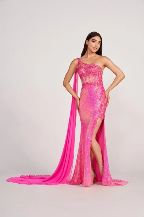 Style EW34020 from Ellie Wilde by Mon Cheri is a memorable sheer bodice sequin prom gown with high side skirt slit. The corset boned bodice features a lace embroidered one shoulder neckline with a flowy chiffon drape.