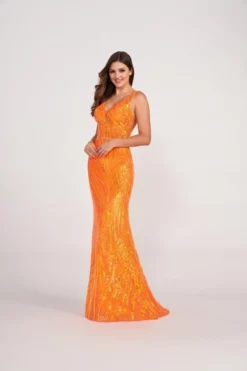 Style EW34037 from Ellie Wilde by Mon Cheri is an extraordinary sequin pattern formal gown with a figure flattering silhouette. The bodice featuring a deep V neckline and over the shoulder straps leading to a strappy back detail. Crystal beading on the jersey gives this gown extra sparkle.