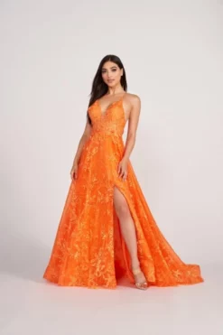 Style EW34102 from Ellie Wilde by Mon Cheri is a cracked ice A-line prom gown that has a plunging V-neckline with mesh insert, narrow straps, criss-cross open back, three-dimensional flowers, pockets, and a thigh high front slit.