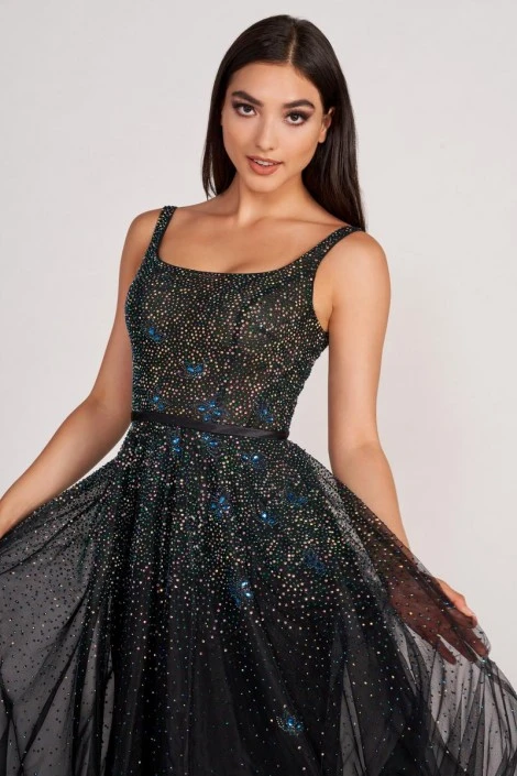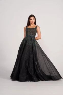 Style EW34115 from Ellie Wilde by Mon Cheri is a tulle and organza A-line prom gown with a sleeveless square neckline, fitted waist, and a scoop back. Crystal beading and stone accents add sparkling to this beautiful gown.