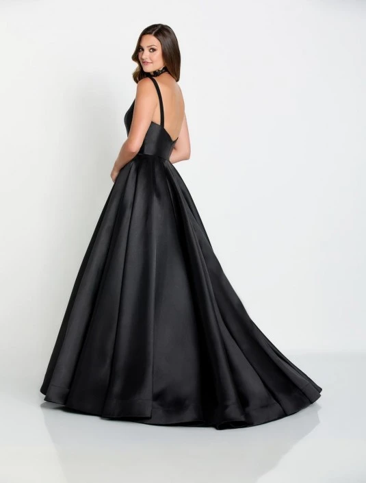 Style EW34130 from Ellie Wilde by Mon Cheri is a Mikado evening gown that has a scoop neckline, fitted waist, wide straps, an open back, and a full softly pleated skirt with pockets.