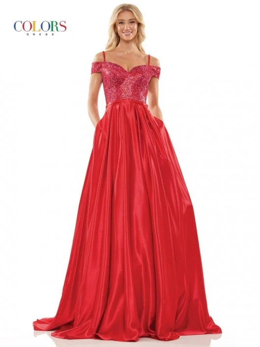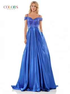 Style G1096 from Glow by Colors Dress is a pretty off the shoulder A-line prom gown with a shimmering bodice and thin over the shoulder beaded straps. A flowing satin A-line skirt with pockets completes the look.