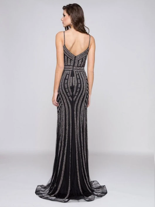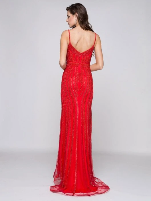 Style G664 from Glow by Colors Dress is a spaghetti strap beaded mesh fitted gown with a V neck front.