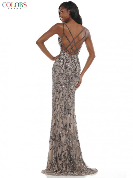 Style K116 from Glow by Colors Dress is a sparkling mesh design prom gown with a sweetheart neckline, strappy open back, thigh high front slit, and a train.