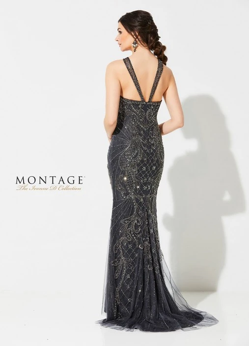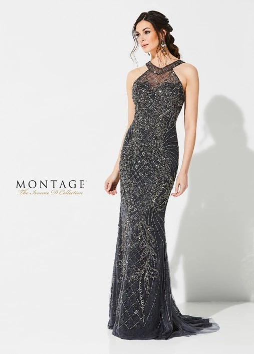 Style 219D74 from Ivonne D for Mon Cheri is richly encrusted with beading from head to toe. This beautiful sleeveless tulle and allover lace sheath mother of the bride gown has a high V-shaped illusion neckline, a sweetheart bodice, beaded V-back straps, and an inset sweep train. A matching tulle shawl with beaded trim is included.