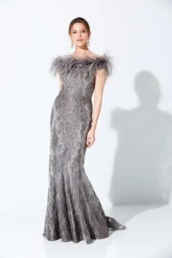 Style 220D22 from Ivonne D for Mon Cheri is an off the shoulder novelty embroidery fit and flare mother of the bride gown with a straight neckline, natural waist, slightly scooped back, horse hair hem, sweep train, and stone accents throughout. Matching Boa is included.