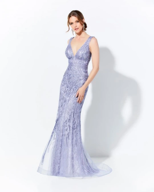 Style 120D03 from Ivonne D for Mon Cheri is a sleeveless beaded metallic ribbon work over allover lace mother of the bride gown that has a front V neckline and square back, inset waistband, trumpet skirt with horsehair hem, and sweep train. Separate modesty piece and matching tulle shawl included.