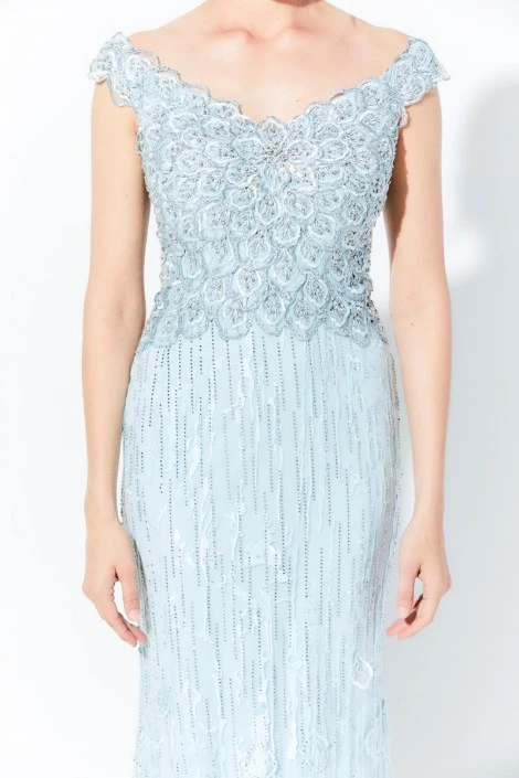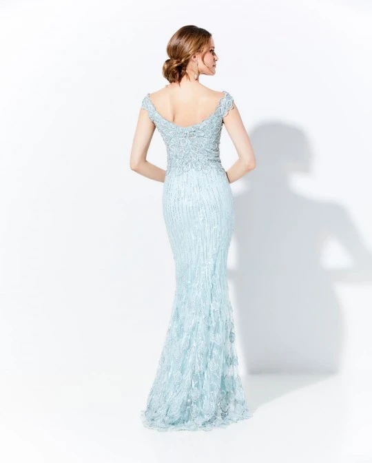 Style 120D09 from Ivonne D for Mon Cheri is a tip-of-the-shoulder embroidered lace trumpet mother of the bride gown that has a V neckline front and back, a beaded bodice with natural waistline, and stone accents and 3D embroidery that decorate the skirt. Matching lace shawl included.