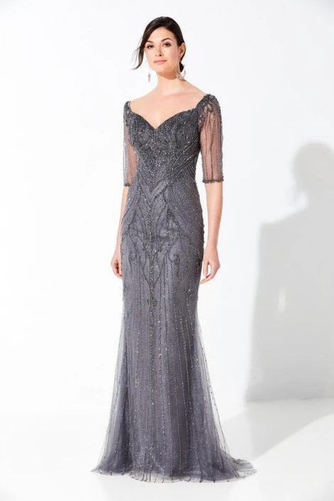 Style 220D32 from Ivonne D for Mon Cheri is an off the shoulder hand beaded tulle and metallic glitter tulle sheath mother of the bride gown that has a sweetheart neckline, sheer three quarter length sleeves, natural waist, soft V-back, and a sweep train. Shawl included.