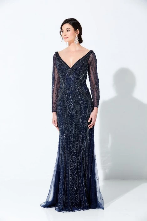 Style 220D33 from Ivonne D for Mon Cheri is a sleeveless beaded tulle fit and flare mother of the bride gown that has a V-neck, natural waist, soft V-back, and a sweep train. Removeable long sleeves and sheer Shawl are included.