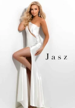 Style 7364 from Jasz Couture is a one-shoulder pageant gown with a front cut-out, thigh high front slit, and a train.