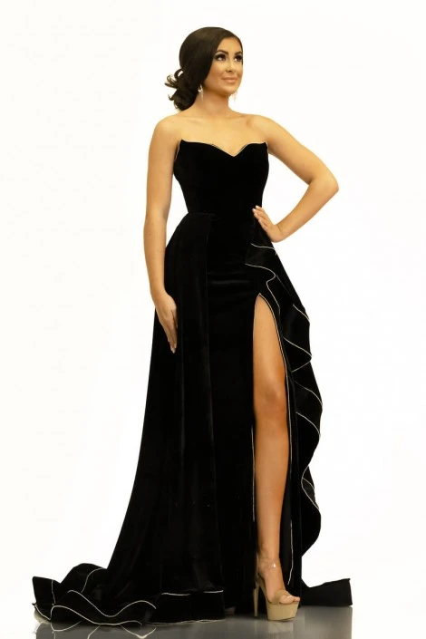 Style 2316 from Johnathan Kayne is a strapless sweetheart stretch velvet A-line gown with a thigh high slit and cascading flounce next to the slit. Contrasting trim creates a magical look to this dress.