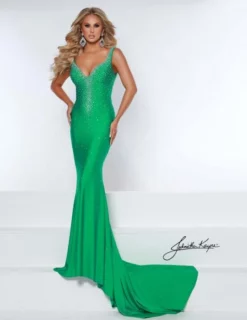 Style 2445 from Johnathan Kayne is a stylish lycra gown about to take the world by storm. The sleeveless gown has a criss-cross low back that is flattering to the frame, and the hot-fix crystals make this gown sparkle all year long!