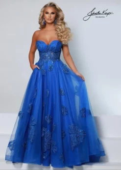 Style 2518 from Johnathan Kayne is a strapless embroidered sequin lace prom ball gown with a sweetheart neckline featuring a sheer corset bodice with exposed boning, embroidered sequin lace tulle flowing skirt.