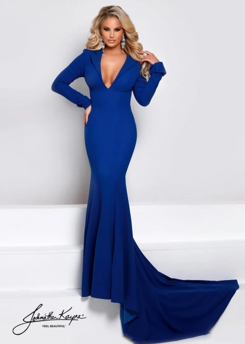 Style 2634 from Johnathan Kayne is a stretch crepe evening gown with a plunging V-neckline, notched collar, long sleeves, stretch lining, fit-n-flare silhouette, and a train.