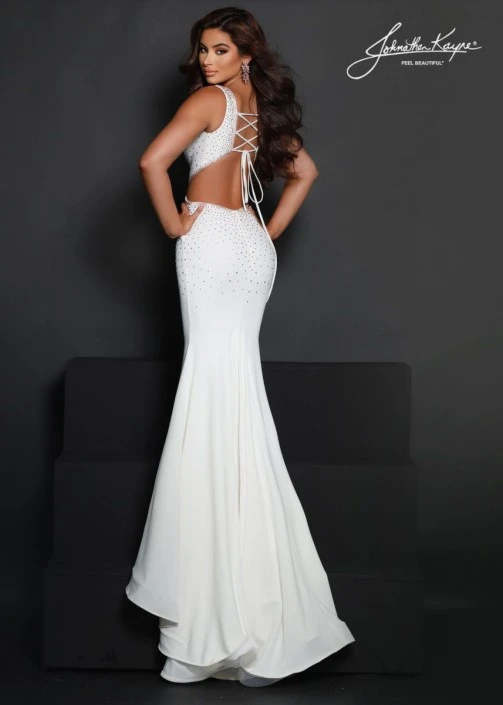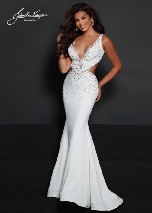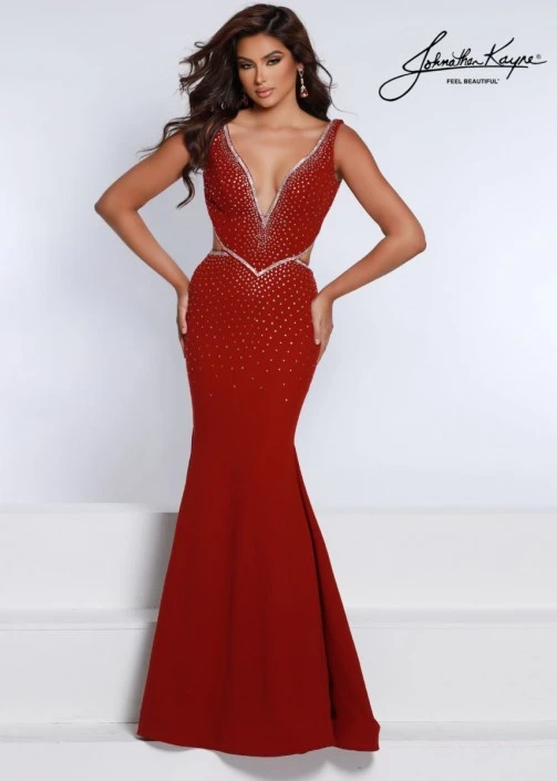 Style 2640 from Johnathan Kayne is a stunning stretch crepe prom gown with a stretch lining. The deep V plunge neckline and side cutouts, together with a lace up back, complete the look.
