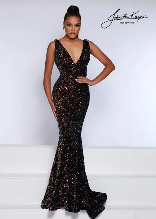Style 2655 from Johnathan Kayne is a sequin velvet evening gown with a plunging V-neckline, wide straps, stretch lining, trumpet silhouette, and a train.