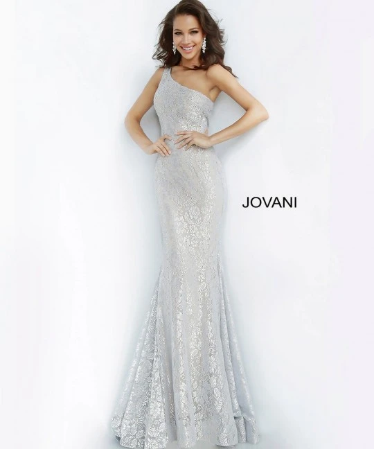 Style 00353 from Jovani is a one shoulder lace mermaid gown.