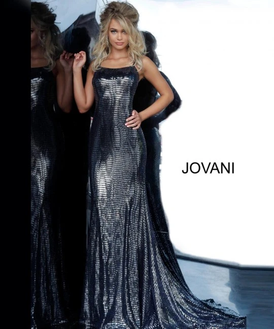 Style 02076 from Jovani is a metallic fitted gown with a straight neckline, and a tie-up back.