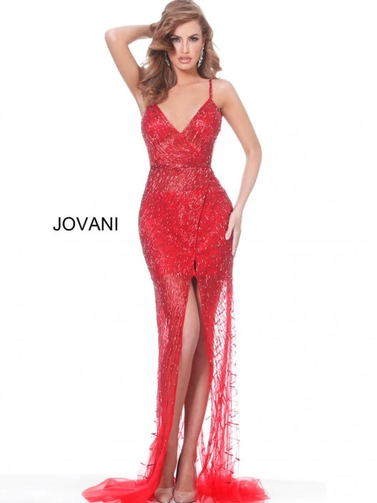 Style 02498 from Jovani is a sheer beaded gown with a V-neckline, fitted waist, narrow straps, low V-back, thigh high front slit, and a sheer sheath train.