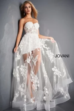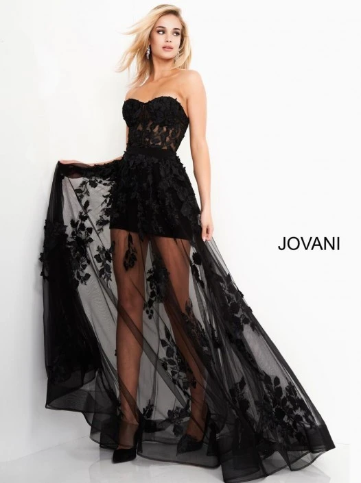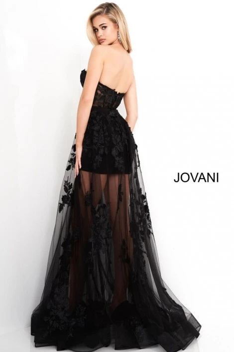 Style 02845 from Jovani is a strapless prom gown with a sweetheart neckline, sheer corset bodice, open back, and a sheer skirt with floral appliques.