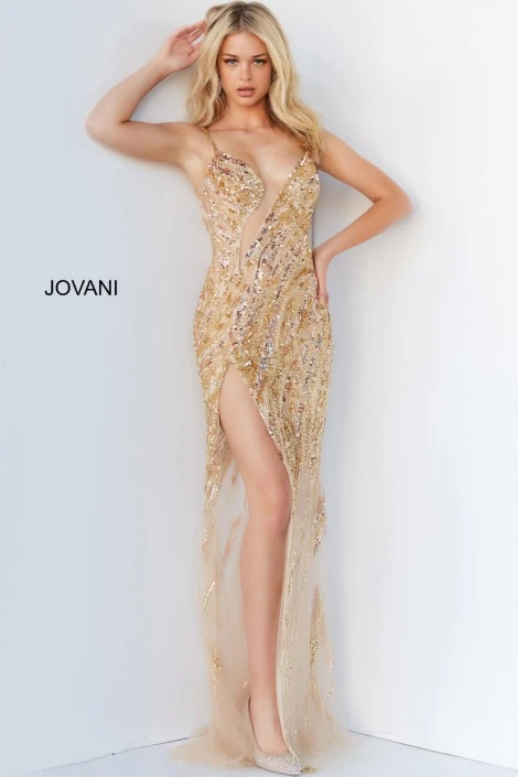 Style 04195 from Jovani is a sexy embellished evening gown with an asymmetric cut-out front with mesh insert, narrow straps, open back, thigh high front slit, and a train.