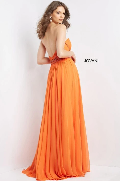 Style 05971 from Jovani is a strapless chiffon A-line prom gown with a V cutout neckline, ruched bodice, and a thigh high front slit.