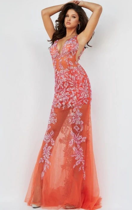 Style 08275 from Jovani is a sheer beaded prom gown with a plunging V-neckline, side cut-outs with mesh inserts, deep open back, and a sheer long skirt with train.