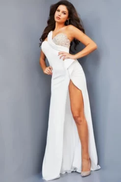 Style 09045 from Jovani is a prom gown with an asymmetrical neckline, partially beaded bust, pleated one-shoulder strap, sexy front slit, and a train.