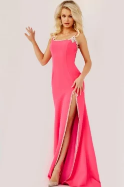 Style 09116 from Jovani is a prom gown with a scoop neckline, spaghetti straps, deep open back, thigh high front slit, and a train. Contrast beading completes this alluring look.