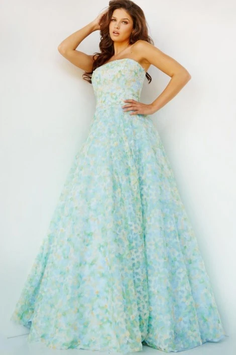 Style 09765 from Jovani is a strapless prom ball gown in a pastel floral print with a straight neckline and thin criss-cross straps on an open back.
