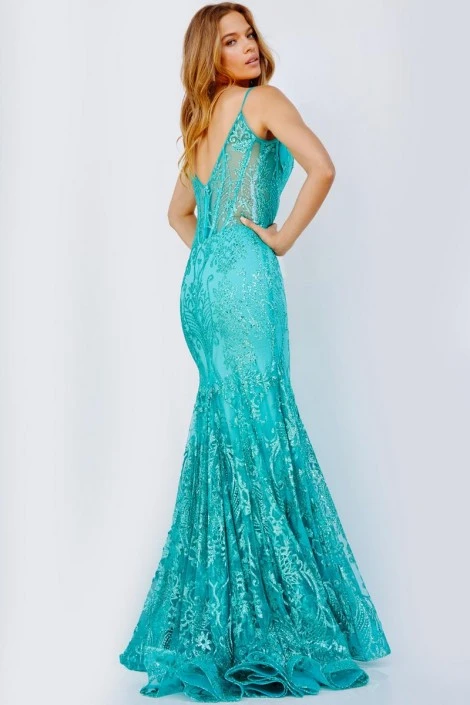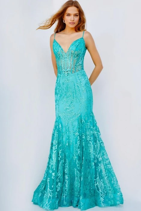 Style 22388 from Jovani is a beautiful prom gown with a V-neckline, sheer illusion corset bodice, thin straps, and a V-back.