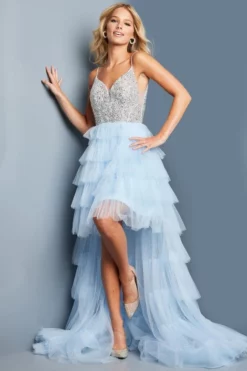 Style 22532 from Jovani is a high-low prom gown with a V-neckline on the beaded bodice, spaghetti straps, deep V-back, and a ruffle tiered skirt.