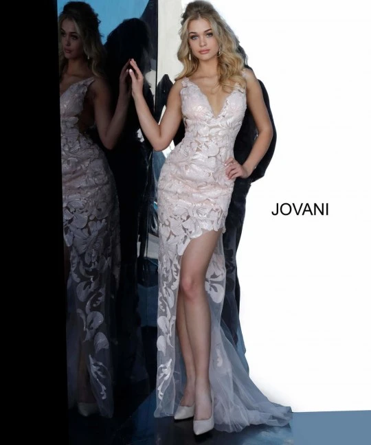 Style 4084 from Jovani is a high low sheer floral gown with a high open slit, sheer side cut outs and an open V back.