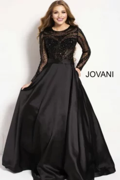 Style 46066 from Jovani is a sheer long sleeve Beaded Bodice Ballgown.