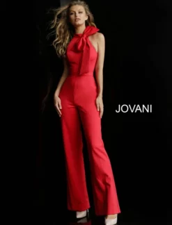 Style 63523 from Jovani is a High Neck Sleeveless Prom Jumpsuit with a bow at the neckline and a racer back.