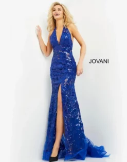 Style 8110 from Jovani is as sequin embellished embroidered long prom dress with a form fitting silhouette, floor length sheer skirt with front high slit and horse hair trim bottom, sleeveless bodice with halter V-neck, and open back.