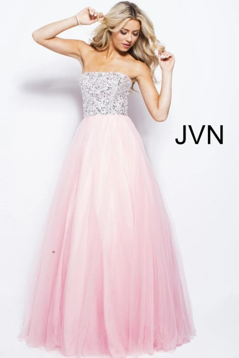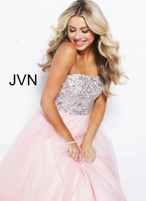 Style JVN52131 from JVN Prom is a strapless prom gown with an embellished bodice and a Tulle prom ball gown skirt.