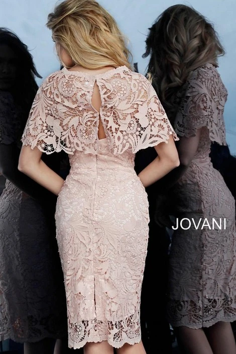 Style 1401 from Jovani is a strapless Fitted Knee Length Lace Cocktail Dress with a removable button back cape style cover.