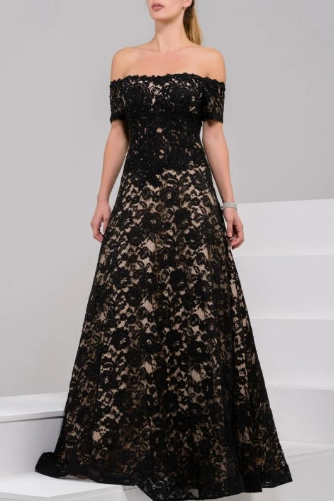 Style 42828 from Jovani is an Off The Shoulder short sleeve Lace Ballgown.