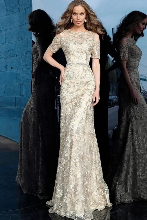 Style 63649 from Jovani is a Short Sleeve Cold Shoulder Form Fitting Embellished Evening Dress.