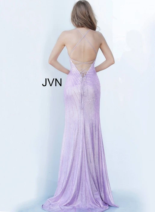 Style JVN03063 from JVN by Jovani is an embellished high slit fitted prom dress with a small train. It showcases a V-neckline with spaghetti straps that wrap around to an open back with a lace up design. You will shimmer in this elegant gown!