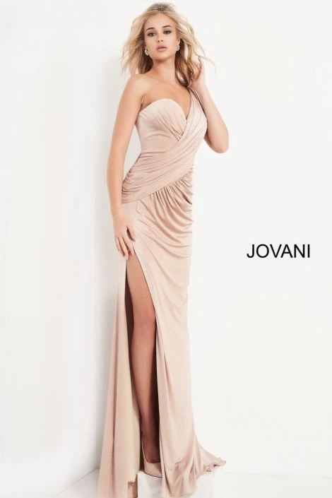 Style JVN04293 from JVN by Jovani is a One Shoulder, Draped Bodice Evening Dress with Thigh High Slit.