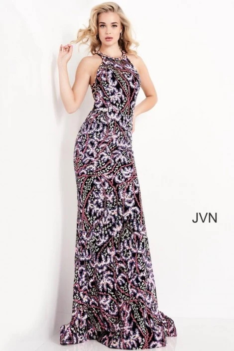 Style JVN05748 from JVN by Jovani is a multi-embroidered open back prom dress with a high neckline, fitted sequins with a sweeping train. It features abstract embroidery, with beaded trim on the high neckline, side insets, and cutout back.